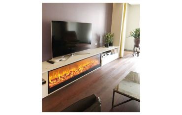 Grande caminetto elettrico da incasso e appoggio modello Amiata, 180 cm di lunghezza, effetto fiamma realizzato mediante LED e regolabile come intensità.