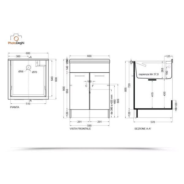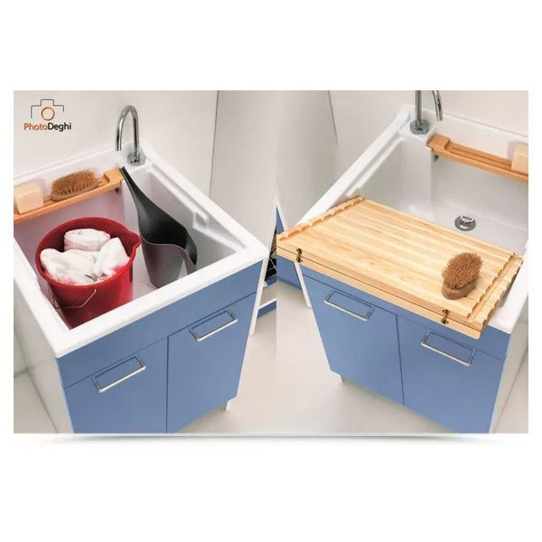 Il mobile si presenta in truciolare nobilitato da 18 mm, con frontali in laminato lucido celeste. L'apertura delle 2 ante è con maniglia cromata. Viene fornito di tavola lavapanni in legno massello, sifone e troppopieno.