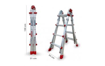 SUPER TELES T4S è la scala telescopica professionale che garantisce 4 modalità di utilizzo: estesa, a forbice, a zoppo o separata in 3 scale differenti. Composta da 4+4 gradini, estendibile a 8+8 con una portata massima 150 kg. l'altezza massima di lavoro è 4,15 mt se aperta, 3,58 mt se a forbice. Costruita secondo le norme EN 131-1, EN 131-4, EN 131-2 2018, supera i test di resistenza di oltre 50.000 cicli di lavoro. Testata dal Politecnico di Milano, ogni scala è dotata del certificato di conformità e collaudo che la rendono la migliore in termini di Resistenza, stabilità e sicurezza.